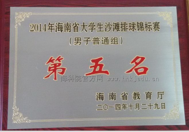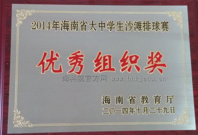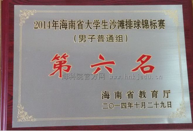 2014年10月24日,由海南省教育厅举办、琼海嘉积中学海桂学校承办的海南省大中学生沙滩排球锦标赛圆满结束。在我校领导大力支持下,公共课部的领导和体育教研室老师们的共同组织下,经过六天激烈的角逐,最终获得本次锦标赛的优秀组织奖和男子普通组第五名、第六名。