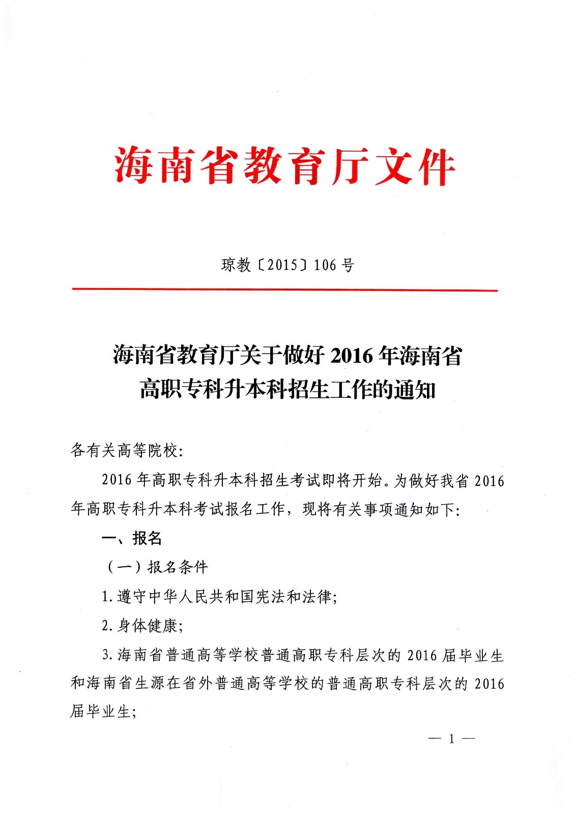 海南省教育厅关于做好2016年海南省高职专科升本科招生工作的通知——琼教【2015】106号文件.rar