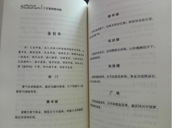 尤其是作者满怀激情,写下了《海科吟》十首,学校的每一处建筑,每一个风景,都是作者选取的素材。作者写道:“乙未仲春,友人力荐入职海南科技职业学院;承蒙不弃,慨然受命。及至学校,感慨良多;理事长一柱南天,倾力办学,痴心教育,业绩斐然。入职方经月,已然海科人。每日晨昏,漫步校园,偶有所感,积而为句,得《海科吟》十章”。而其一《校门》:“紫气东来畅惠风,盛世无疆河晏清;天下英雄尽入彀,教育兴国杨秀英。”赞颂之情,溢于言表。