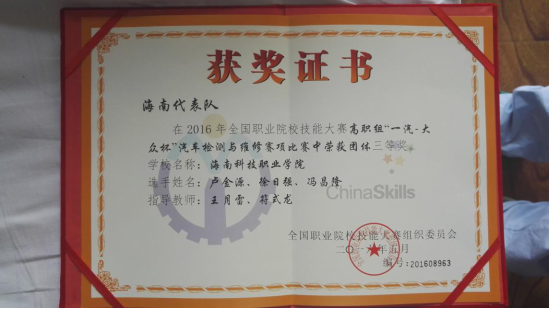 6月3日,2016年全国职业院校技能大赛吉林赛区“一汽大众杯”汽车检测与维修和汽车营销赛项在长春汽车工业高等专科学校圆满落幕,我校代表队获得团体三等奖,为海南省赢得该赛项唯一一块奖牌,为学校增添了荣誉。