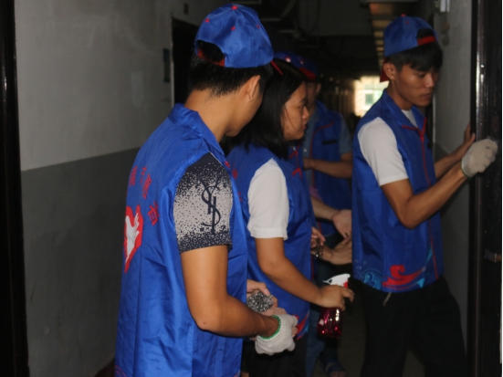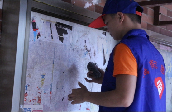 本次志愿有近100名志愿者参加,志愿者们分五或六人一组,分别对学校行政楼、教学楼、宿舍楼、食堂等地方的小广告进行了一一清理。他们有拿的着桶提水,有的拿抹布,还有的拿钢丝刷、垃圾袋,可谓“全副武装”,工具齐全,俨然就像一支支清洁队,看上去十分专业。志愿者们运用手上的工具,认真清除非法张贴在墙壁上、柱子上、门上的各类小广告。经过志愿者们两小时的辛勤付出,大部分广告被清除了,展现在我们面前的又是一个清爽干净的校园。