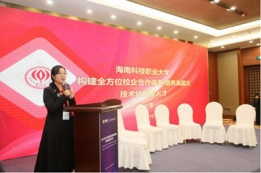 张小莹副校长同时也是海南科技职业大学理事会理事,此次代表学校创校校长、理事长杨秀英教授在圆桌论坛上作《构建全方位校企合作体系 培养高层次技术技能型人才——海南科技职业大学深化校企合作的探索与实践》主旨发言。张小莹从“领导重视,强化组织制度保障”,“一院一策,激活创新体制机制”,“解决难题,实现校企合作共赢”,“引企入教,深化育人方式变革”,“企业参与,共同制定人培方案”,“聚集课改,示范带动榜样引领”,“考察调研,助推校企深度融合”等七个方面对学校近年来响应中央及地方号召,在深化校企合作、产教融合上采取的一系列有力举措及取得的突出成效作了经验交流。