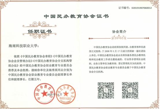 2019年11月16日,中国民办教育协会职业教育专业委员会成立会暨精准推动职业教育创新论坛在山东威海召开,中国民办教育协会会长王佐书,中国民办教育协会职业教育专业委员会理事长蔺琪,以及来自全国民办职业大学、职业学院70余名董事长、校长和教育界同仁,齐聚威海,共商新时代民办职业院校高质量发展大计。会议由蔺琪理事长主持。海南科技职业大学委派副校长张小莹、刘成有,信息工程学院执行院长李国章参加此次会议。
